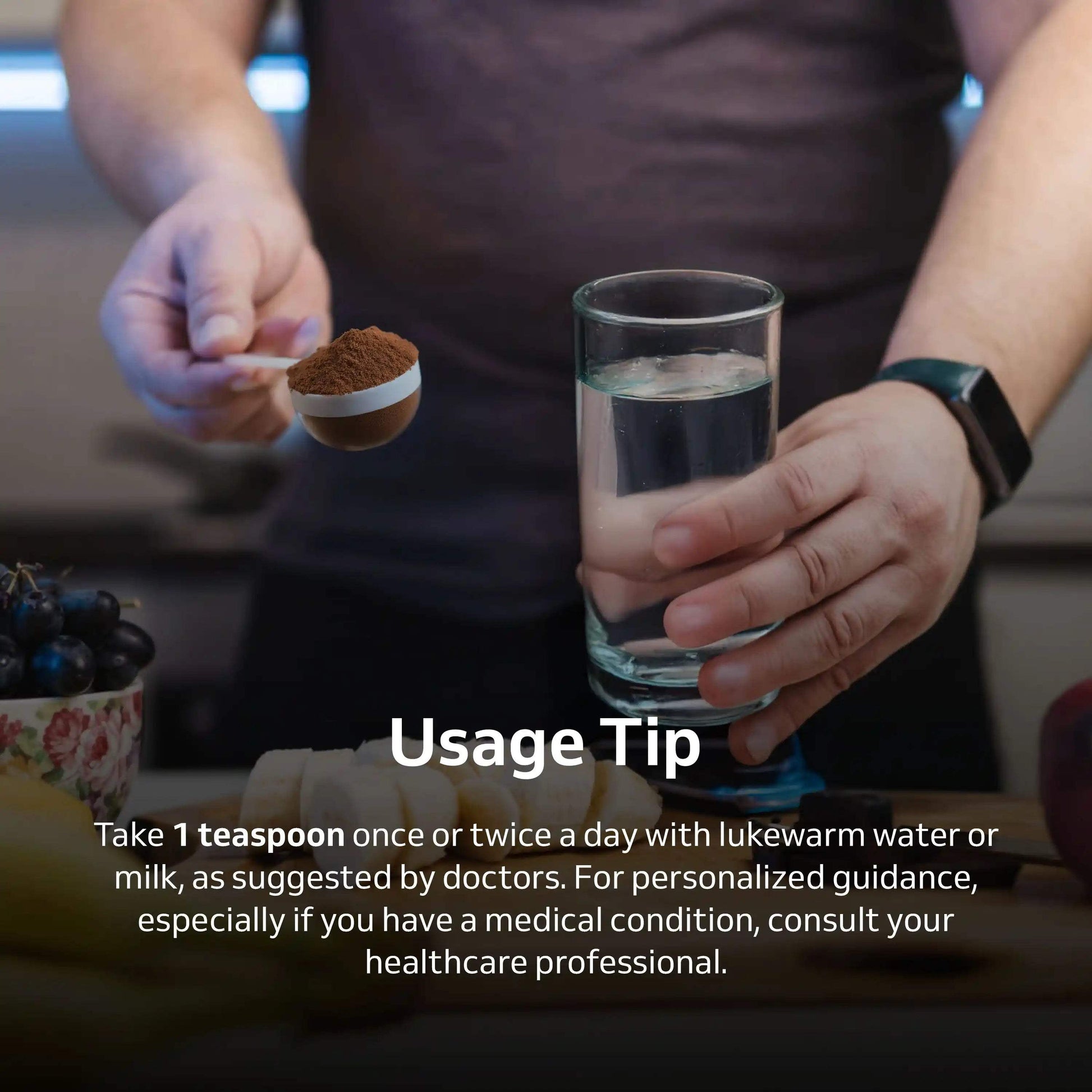 Take 1 teaspoon once or twice a day with lukewarm water or milk, as suggested by doctors. For personalized guidance, especially if you have a medical condition, consult your healthcare professional.